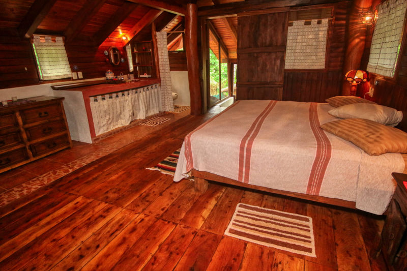 The cabana is a 2nd floor unit built out of wood with a king sized bed and bathroom.